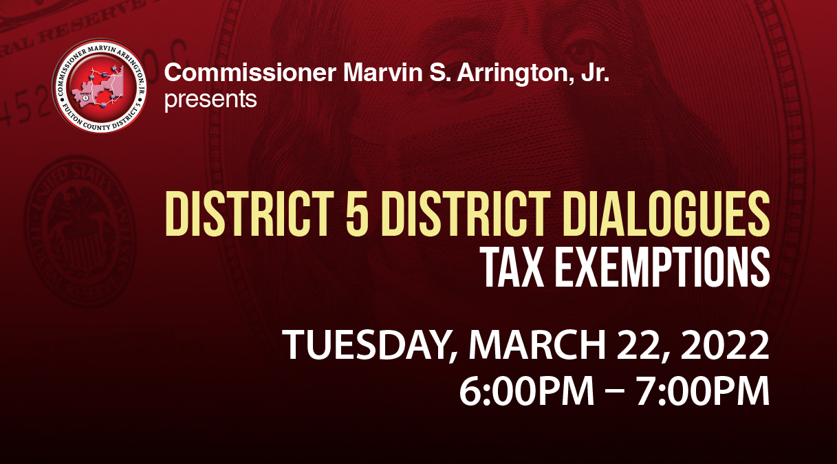 WHAT: Fulton County District 5 Commissioner Marvin S. Arrington, Jr. presents the District 5 Dialogues. During this virtual discussion, the Commissioner will meet with residents to provide important updates and to answer questions regarding the topic of Tax Exemptions.