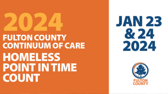 The 2024 Point in Time Count will take place January 23 (North Fulton) and January 24 (South Fulton). The Fulton County Department of Community Development (DCD), as the collaborative applicant for the GA-502 Fulton County Continuum of Care (COC) is coordinating the count.