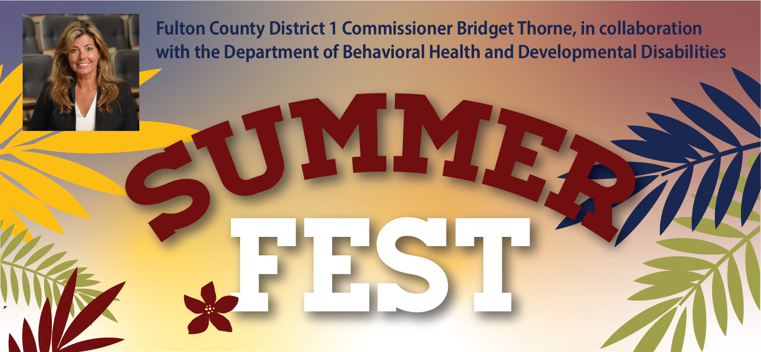 Fulton County Commissioner Bridget Thorne in collaboration with the Fulton County Department of Behavioral Health & Developmental Disabilities (BHDD) presents the District 1 Summer Fest on Saturday, June 8, 2024 from 10 a.m. to 2 p.m. at the Fulton County Health & Human Services Center, North Fulton, 4700 North Point Parkway, Alpharetta, GA 30022.