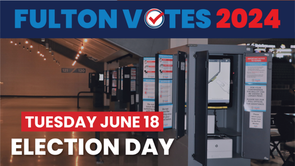 The Fulton County Board of Registration & Elections will hold a Special Election Day meeting on Tuesday, June 18, 2024, at 6:30 p.m. in the Fulton County Elections Hub and Operations Center, 5600 Campbellton Fairburn Road Fairburn, GA 30213. The board will receive updates regarding the June 18 General Primary and Special Runoff Election.